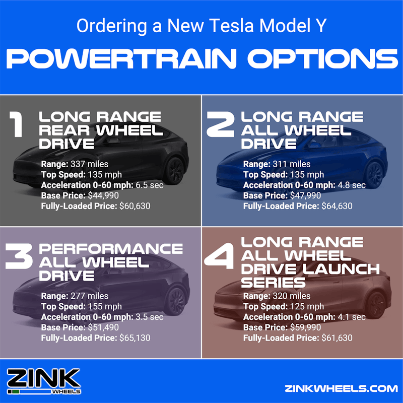So back up to the powertrain options. As of today, there are currently four packages to pick from: 'Long Range Rear Wheel Drive', 'Long Range All Wheel Drive', 'Performance All Wheel Drive', and the new Model Y 'Long Range All Wheel Drive LAUNCH Series' vehicle. That's a mouthful.